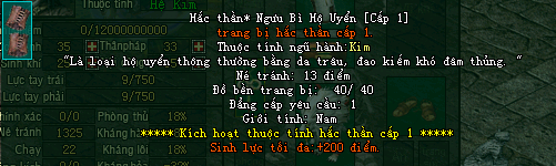 Thông tin: Đủ bộ trang bị hắc thần (mũ,áo,giày,đai,hộ uyển) Tạo thành vòng sáng Hắc Thần và kích hoạt thuộc tính ẩn gia tăng sức mạnh